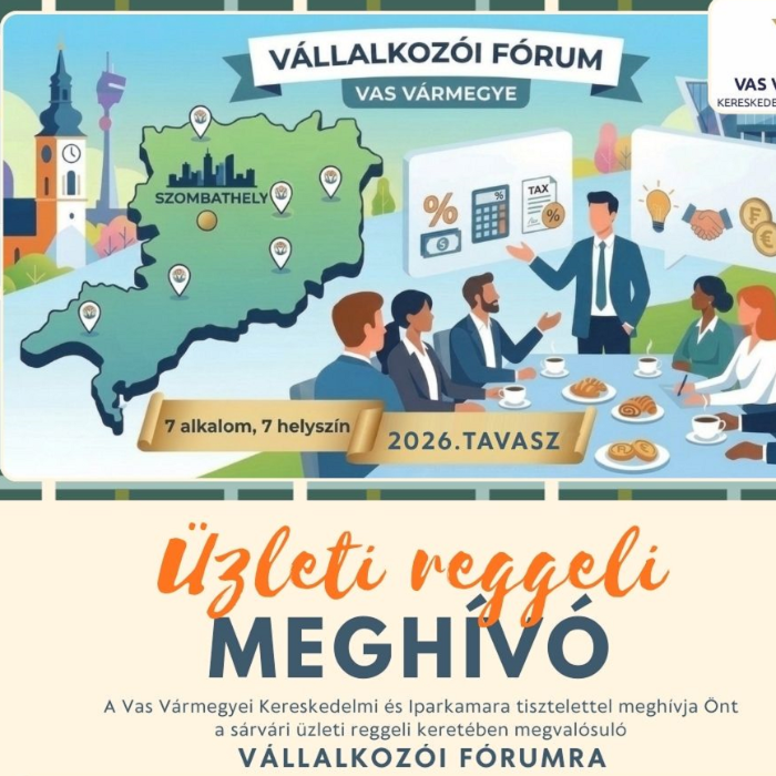 2026 tavaszán 7 alkalommal és 7 helyszínen tart üzleti reggeli keretében megrendezésre kerülő vállalkozói fórumot a Vas Vármegyei Kereskedelmi és